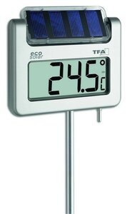 Deze tuinthermometer meet eenvoudig de buitentemperatuur in uw tuin of balkon. Dankzij de lange voet kunt u de thermometer gemakkelijk in de grond of in een plantenbak steken. Als extraatje heeft deze thermometer verlichting die werkt op een zonnepaneel. De thermometer is gemaakt van aluminium en kan het gehele jaar buiten staan. Er zijn drie verschillende weergaves mogelijk: 1. temperatuur, 2. wisseling tussen radiogestuurde klok en temperatuur, 3. wisseling tussen radiogestuurde klok, temperatuur en min-max temperatuur.