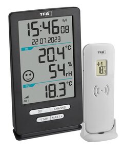 Zwart gekleurd weerstation met buitensensor met een maximaal bereik van 100 meter. Op het weerstation zelf worden de binnen- en buitentemperatuur weergegeven plus de binnenluchtvochtigheid. De binnenluchtvochtigheid wordt beoordeeld aan de hand van een smiley. Tevens slaat het weerstation de minimale en maximale temperatuur op. Boven in het display staat de radiogestuurde tijd en de datum van de dag. Het weerstation is neer te zetten of op te hangen, aan u de keus.